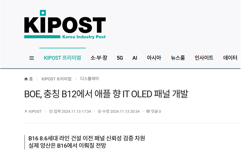 11月14日消息,據(jù)韓媒報道,京東方在重慶 B12 的6代OLED面板廠為蘋果公司開發(fā) IT 用OLED面板,這是為了在B16 8.6代OLED產線投產之前驗證面板的可靠性。
