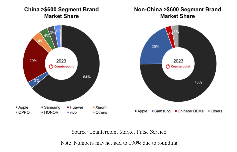 報告中還著重提到,在中國市場600美元以上價位,雖然蘋果仍占據(jù)超過 60% 的市場份額,但華為、小米、OPPO、vivo 和榮耀等品牌一直積極提升其旗艦產品線,推出業(yè)界領先的相機系統(tǒng)和其他功能,其份額不斷提高。