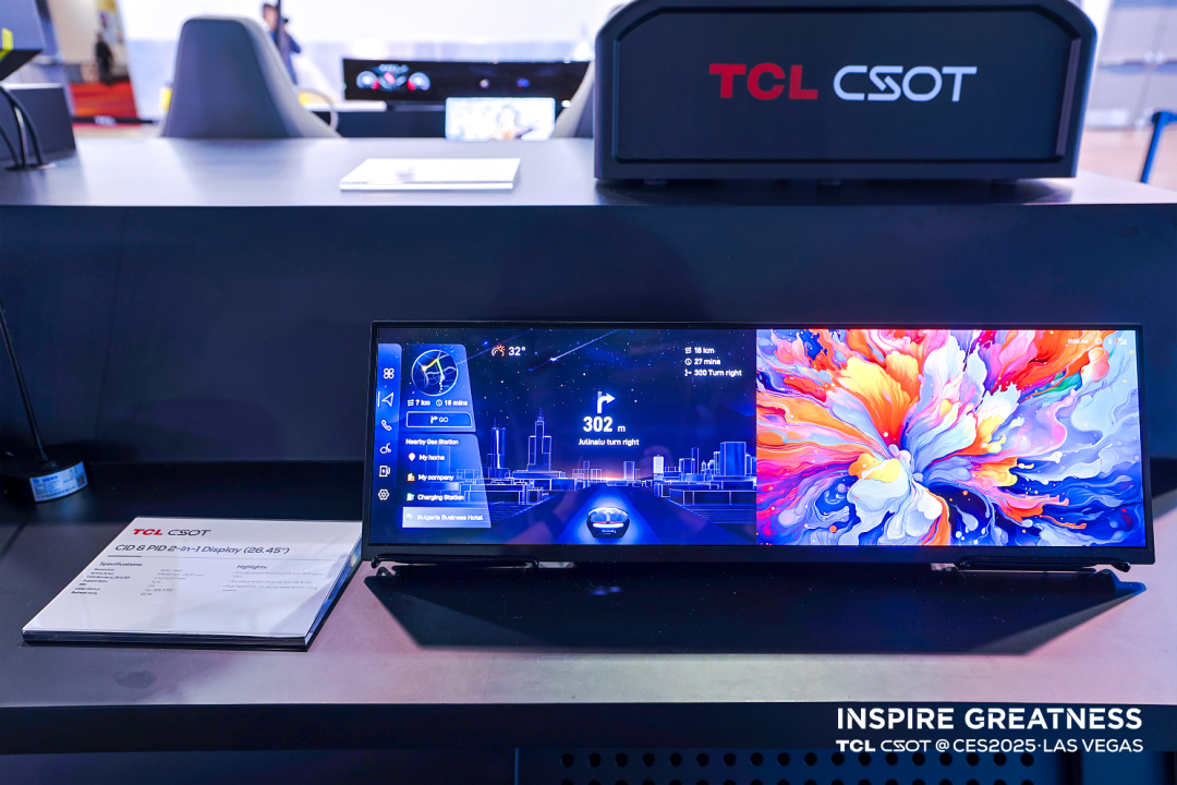 現(xiàn)場展示的26.45" 極致驅(qū)動車載屏采用32:9的超寬長寬比設(shè)計,AA尺寸相當(dāng)于兩塊14.6" 傳統(tǒng)中控屏,帶來前所未有的寬廣視覺體驗。同時采用兩顆TDDI IC驅(qū)動極致IC方案實現(xiàn)26.5" 5.1K分辨率,打造卓越視覺效果;采用極窄邊框設(shè)計,整體無分界線,中控和副駕屏幕實現(xiàn)一體式呈現(xiàn),為UI設(shè)計和APP應(yīng)用提供更多創(chuàng)新空間。