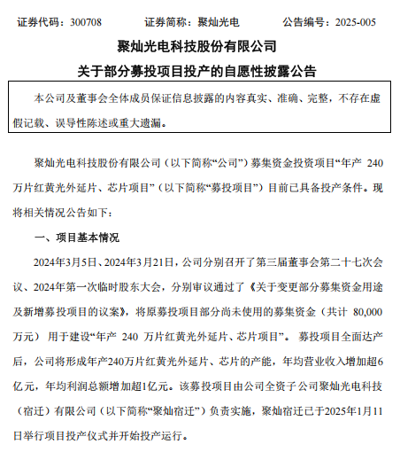 聚燦光電(以下簡稱“公司”)發(fā)布公告,公司募集資金投資項目“年產(chǎn) 240萬片紅黃光外延片、芯片項目”目前已具備投產(chǎn)條件。該募投項目由公司全資子公司聚燦光電科技(宿遷)有限公司(以下簡稱“聚燦宿遷”)負責(zé)實施,聚燦宿遷已于2025年1月11日舉行項目投產(chǎn)儀式并開始投產(chǎn)運行。