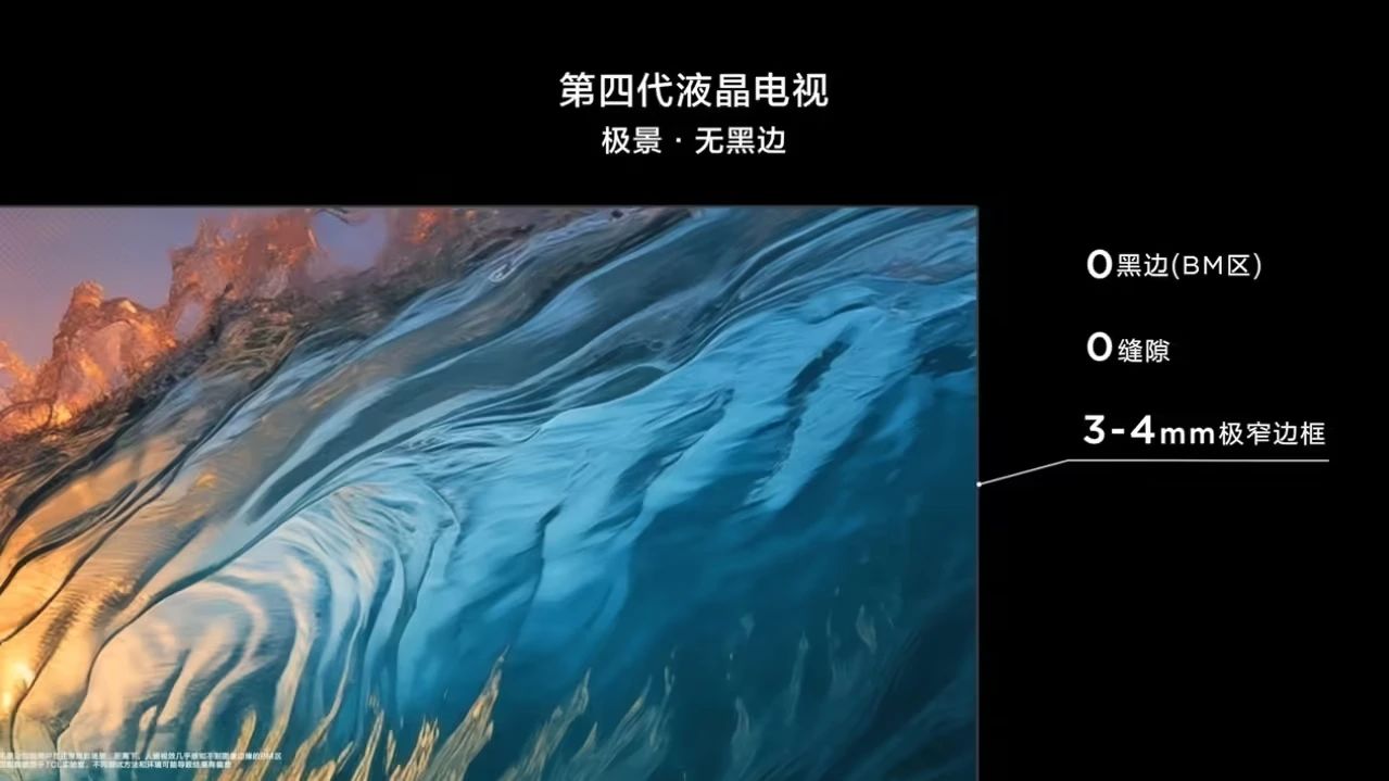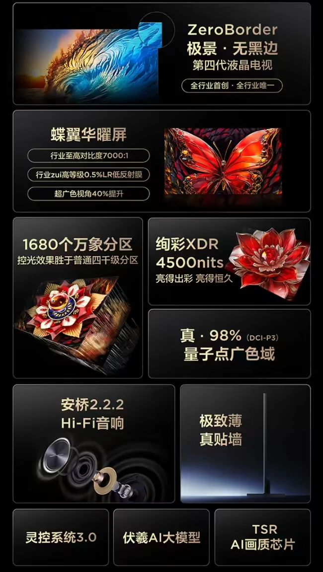 據介紹,這款產品屏體采用定制化高端材料,同時使用行業領先的自研仿真工藝及精密封屏技術,消除電視黑邊,達到極景顯示。產品搭載“蝶翼華曜屛”,在保持7000:1超高原生對比度的同時,采用極窄無黑邊技術,搭載0.5% LR低反射膜,降低屏幕反光。
