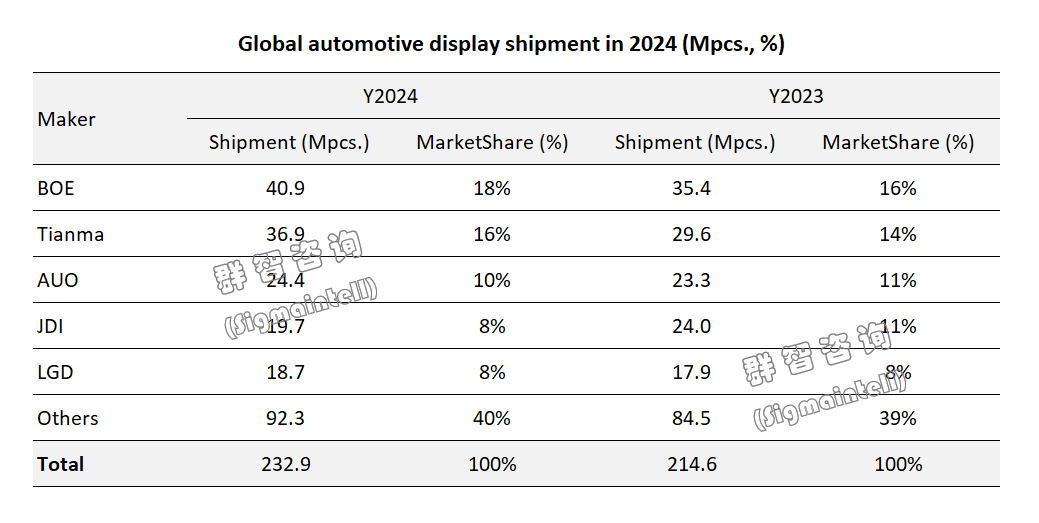 2024年友達(dá)車載業(yè)務(wù)穩(wěn)健增長,出貨約為 2440 萬片,占 10.0% 的市場份額位居全球第三。AUO在車載顯示技術(shù)方面一直保持著較高的研發(fā)水平,不斷推出具有創(chuàng)新性的產(chǎn)品,如曲面設(shè)計(jì)、大尺寸貼合以及AmLED等尖端顯示技術(shù)方面等,在高端車載面板市場占據(jù)一席之地。2024年更是確定了融合BHTC(Behr-HellaThermocontrol)子公司資源的戰(zhàn)略,整合了車用顯示器與人機(jī)交互界面的研發(fā),致力于構(gòu)建先進(jìn)的智慧車艙系統(tǒng)解決方案,深化布局車載顯示產(chǎn)業(yè)和拓展國際市場,為公司的長遠(yuǎn)發(fā)展注入了新的活力和競爭優(yōu)勢。
