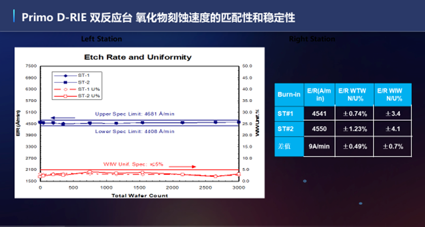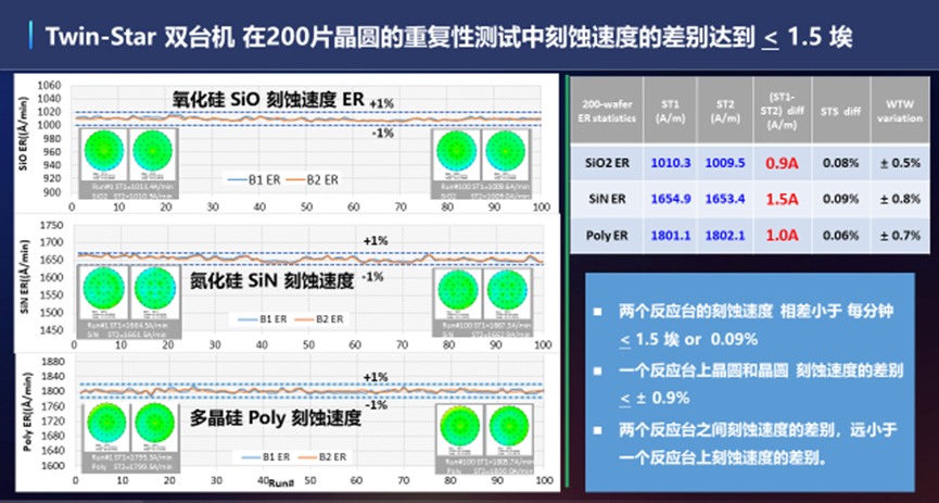 在200片硅片的重復性測試中,氧化硅、氮化硅和多晶硅的測試晶圓,在左右兩個反應臺上各100片的平均刻蝕速度相差,各為每分鐘0.9埃,1.5埃和1.0埃。兩個反應臺之間平均刻蝕速度的差別(≤ 0.09%),遠小于一個反應臺加工多片晶圓刻蝕速度的差別(≤ 0.9%)。