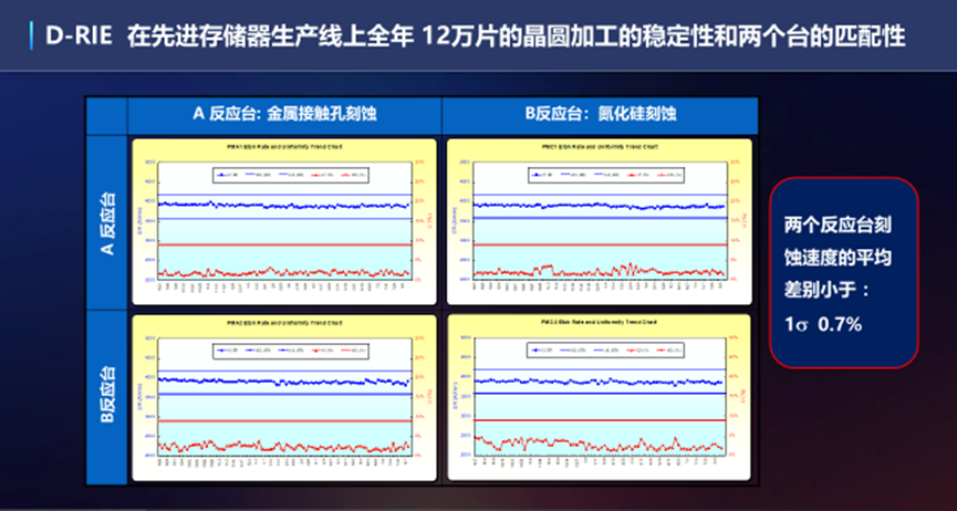 在兩個反應臺各輪流加工1000片的重復性測試中,兩個反應臺的平均刻蝕速度相差,只有每分鐘9埃,小于1.0納米(圖3)。在海外先進存儲器生產線上,全年加工的12萬片晶圓的全過程中,兩個反應臺在兩個刻蝕應用上刻蝕速度的差別1sigma小于0.7%(圖4)。