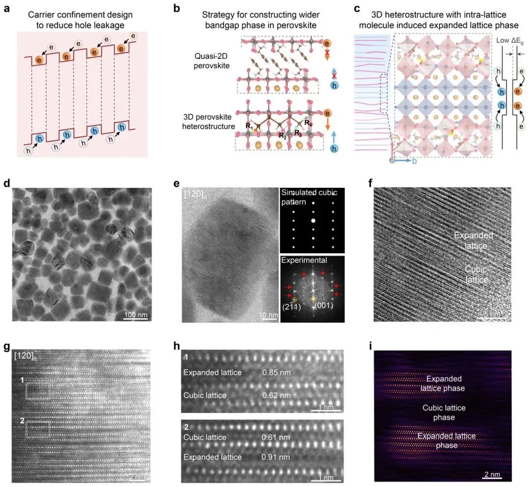 姚宏斌團隊提出一種新的材料結(jié)構(gòu)設(shè)計——“三維鈣鈦礦異質(zhì)結(jié)”有效抑制了空穴泄漏。團隊在鈣鈦礦晶格內(nèi)部插入有機分子,改變發(fā)光層晶體結(jié)構(gòu),構(gòu)建了阻攔空穴離開發(fā)光層的“水壩”——“寬帶隙能壘”,在實現(xiàn)載流子限域的同時,保持高遷移率。姚宏斌教授聯(lián)合胡偉教授對這一創(chuàng)新型設(shè)計進行了理論結(jié)構(gòu)分析,林岳教授則利用球差電鏡充分驗證了這一材料。
