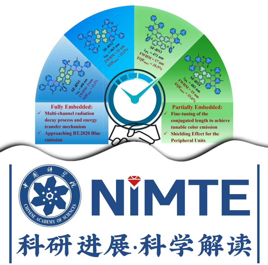 近期,中國科學(xué)院寧波材料技術(shù)與工程研究所有機(jī)光電材料與器件團(tuán)隊(duì)葛子義研究員、李偉副研究員,聯(lián)合華南理工大學(xué)蘇仕健教授提出一種分子設(shè)計(jì)策略,將剛性 9,9'-螺雙[芴](SF)單元全部或部分整合到B/N-分子內(nèi)電荷轉(zhuǎn)移(MR)發(fā)光核心中(圖1),成功開發(fā)了含螺芴的MR-TADF材料體系SF-BN1、SF-BN2、SF-BN3 和 SF-BN4,它們具有高色純度和高效率的特性。對于完全嵌入 B/N-MR 核心的發(fā)光體SF-BN1和SF-BN2,SF中的sp3雜化碳原子將每個分子分成對稱的部分,形成兩個獨(dú)立且剛性的B/N-MR 發(fā)光中心。這阻礙了共軛結(jié)構(gòu),降低了共軛長度,發(fā)射出深藍(lán)光,并通過多通道輻射衰減過程和能量轉(zhuǎn)移機(jī)制顯著提高了材料效率。對于部分嵌入B/N-MR 核心的發(fā)光體SF-BN3 和 SF-BN4,芴嵌入的 B/N-MR 核心可以連接B/N2[4]螺旋烯亞單元,形成剛性分子框架。值得注意的是,SF-BN1、SF-BN2、SF-BN3 和 SF-BN4 在稀釋的甲苯溶液中實(shí)現(xiàn)了最小的半峰全寬(FWHM)值分別為17 nm、21 nm、17 nm和15 nm,并且在摻雜薄膜中高光致發(fā)光量子產(chǎn)率高達(dá)90%,這表明它們具有出色的電致發(fā)光(EL)潛力。基于 SF-BN1、SF-BN2、SF-BN3 和 SF-BN4 的相應(yīng)超熒光有機(jī)發(fā)光二極管(HF-OLED)峰值外量子效率(EQE)分別達(dá)到了29.0%、22.2%、35.5%和33.6%,對應(yīng)的 CIE 坐標(biāo)分別為(0.13,0.08)、(0.11,0.15)、(0.13,0.23)和(0.12,0.35),F(xiàn)WHM 值分別為 23 nm、32 nm、26 nm和 40 nm。
