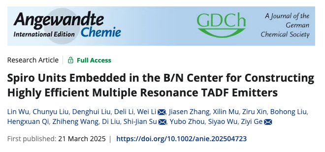 面向超高清顯示(UHD)技術(shù)的核心需求,紅、綠、藍(lán)窄譜帶發(fā)光材料的研發(fā)已成逐漸成為OLED領(lǐng)域的研究熱點(diǎn)。傳統(tǒng)熒光材料由于局部激發(fā)態(tài)(1LE)的展寬效應(yīng),其半峰寬(FWHM)通常大于40 nm;而磷光材料則因配體-配體三重態(tài)電荷轉(zhuǎn)移態(tài)(3LLCT)或配體-金屬中心三重態(tài)電荷轉(zhuǎn)移態(tài)(3MLCT)的電荷轉(zhuǎn)移機(jī)制導(dǎo)致光譜展寬,難以滿足UHD技術(shù)對高色純度的嚴(yán)苛要求。基于硼/氮摻雜多環(huán)芳烴(B/N-PAHs)的多重共振熱活化延遲熒光材料(MR-TADF),通過MR效應(yīng)和剛性分子結(jié)構(gòu)顯著降低了材料的FWHM,展現(xiàn)出作為未來OLED材料的巨大潛力。然而,其剛性平面結(jié)構(gòu)顯著提高了單重態(tài)-三重態(tài)能隙(ΔEST),從而大幅衰減了反向系間竄越(RISC)速率,限制了器件效率的進(jìn)一步提升。