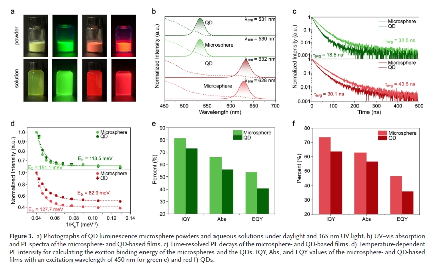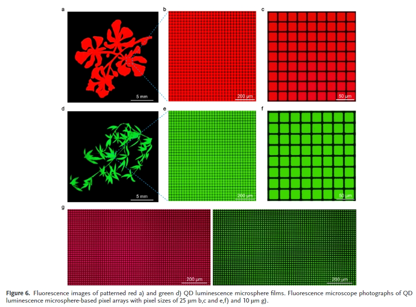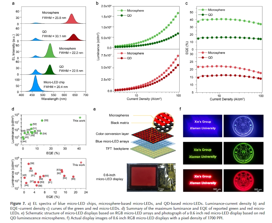 微米級發光二極管(Micro- LED)以其超高分辨率、超高亮度、響應速度快、高對比度、低功耗等特點被認為是下一代顯示技術。然而,傳統無機III-V半導體LED小型化到微尺度(≤50µm)的過程中,面臨著綠色和紅色LED輻射效率急劇下降、傳質困難、紅綠藍(RGB)像素驅動電壓失配等技術和性能方面的挑戰,嚴重影響了其商業化進程。為了解決這些問題,采用納米級尺寸、高效率、窄帶發射、高色純度的紅、綠量子點(QDs)作為顏色轉換材料,與藍色微型LED結合,實現了全彩微型LED顯示。該方法有望簡化傳質,易于驅動電路,成本低。