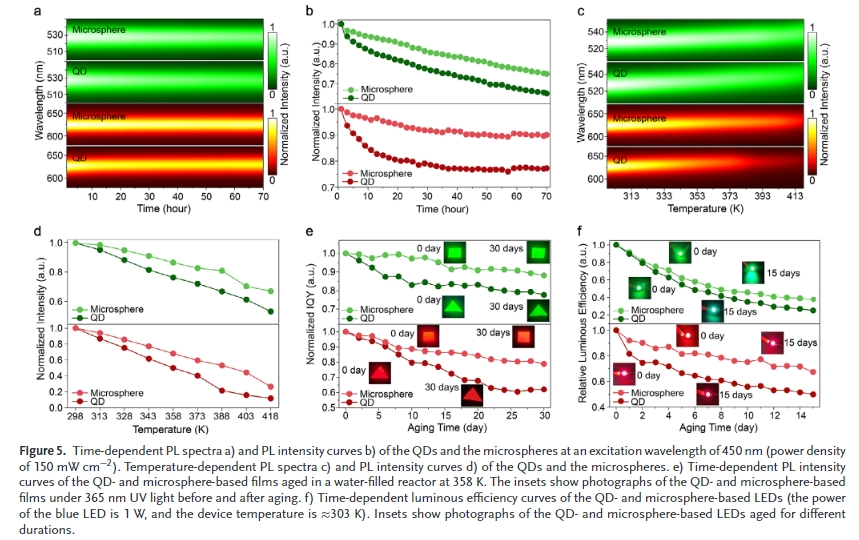 然而,由于量子點在藍色區域的消光系數低,量子點的光提取效率(LEE)較差,導致量子點轉換的微型LED藍光泄漏嚴重,發光效率低,因此量子點顏色轉換層(CCL)的性能仍然較低。最近,通過將量子點嵌入到納米多孔GaN中,并在器件中添加濾色器(CF)或分布式布拉格反射器(DBR)來吸收或反射量子點無法吸收的殘留藍光,可以有效地抑制藍光泄漏。然而,這些方法不可避免地會增加功耗,降低視角,并增加微型LED顯示屏的表面溫度。此外,對于傳統的QD顯示器,QD CCL被夾在兩個厚度高達260微米的水氧阻隔層之間,以提高顯示器的可靠性這種策略不適合微型LED,因為長寬比會顯著增加,這使得小像素(<50µm)的圖案難以形成。雖然可以通過涂覆二氧化硅殼、氧化鋁殼或硅氧烷配體來制備更薄、更穩定的量子點像素,而無需使用水-氧屏障層,從而提高量子點的PL穩定性,但由于硅烷水解、表面配體修飾或原子層沉積(ALD)對量子點表面的破壞和較低的藍色吸收率,從而大大降低了量子點的顏色轉換性能,增加了非輻射復合。因此,構建同時具有優異色彩轉換效率和優異PL穩定性的量子點材料是實現高可靠性全彩微型LED的關鍵。