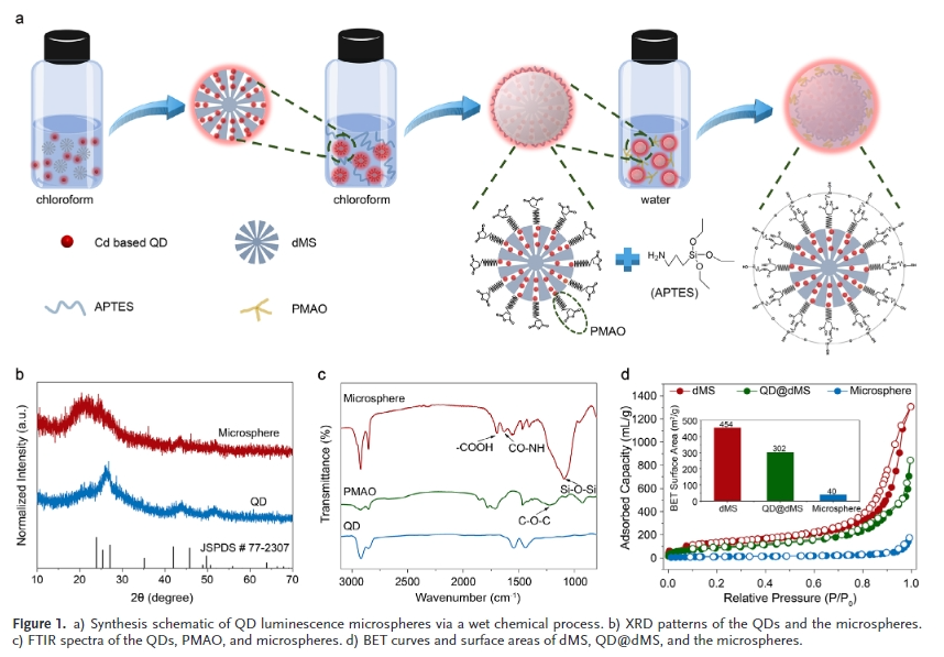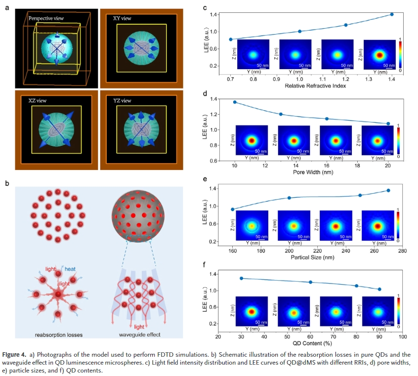 樹突狀介孔硅球(dms)具有直徑可調、介孔豐富、高折射率、優異的光學透過率和較強的化學穩定性等特點。因此,將量子點封裝在dms的介孔中,可以提高量子點的顏色轉換性能和可靠性。介孔的空間限制作用降低了量子點的重吸收,使量子點與水和氧分離。此外,在介孔和填料之間形成的光學微腔改善了激發光和發射光的局部光場。然而,有幾個關鍵問題需要解決,如:如何在密封過程中抑制有機配體脫落并減少對量子點表面的損傷;封裝結構如何影響顏色轉換性能。
