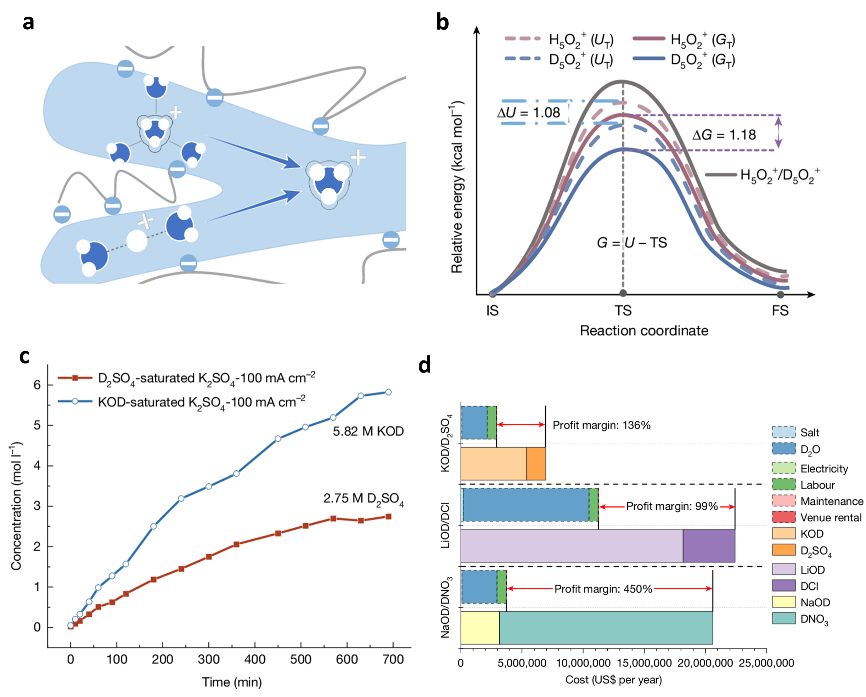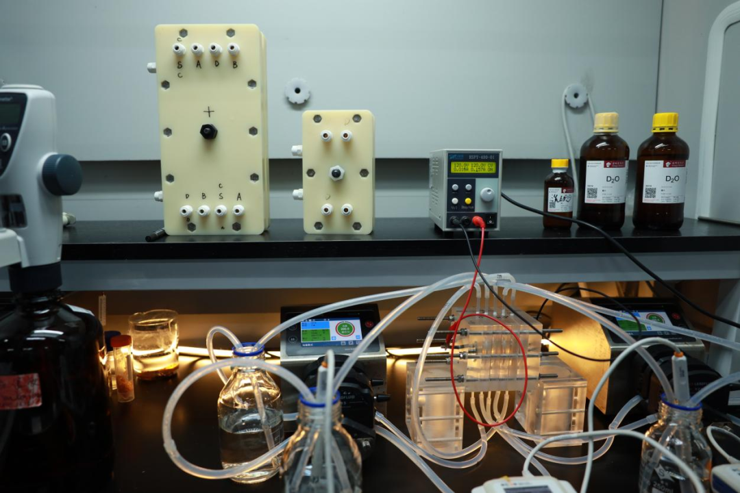 此次研究以廉價的無機鹽和重水為原料,在室溫條件下利用雙極膜解離重水,一步生成高濃度的氘代酸和氘代堿,大幅降低了生產成本,有望為下游眾多氘代化學品提供經濟、優質的氘代酸堿原料。
