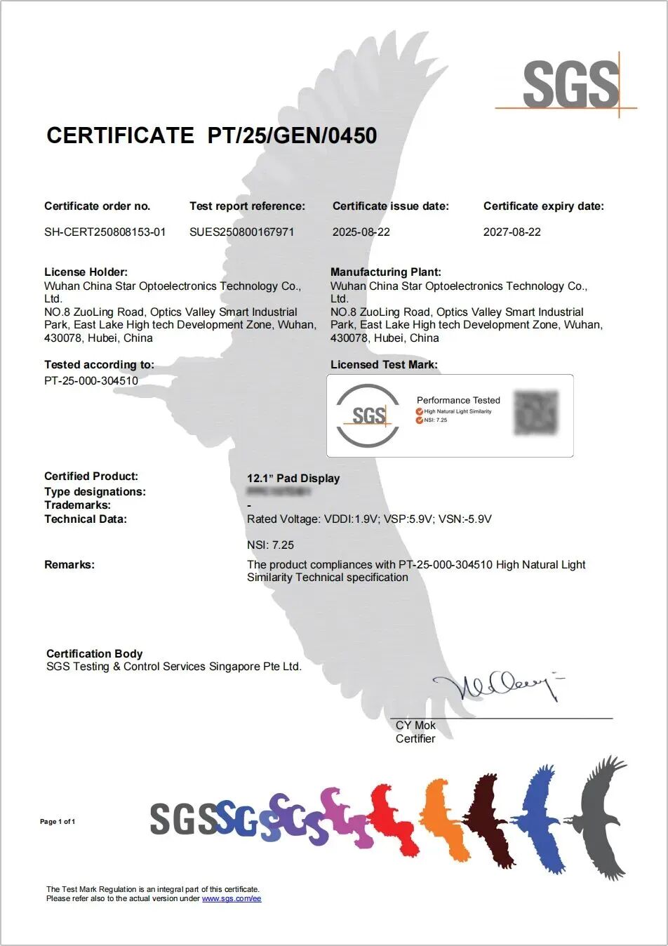 2025年9月1日,SGS高自然光相似度認證頒獎儀式在TCL華星武漢基地隆重舉行,TCL華星研發中臺武漢研發中心長薛景峰、TCL華星專顯BU銷售處及智能硬件負責人穆樹祥與SGS中國區副總裁趙暉等領導共同出席。本次頒獎儀式上,TCL華星12.1"教育平板顯示憑借優異的綜合表現,榮獲國際公認的測試、檢驗和認證機構SGS頒發的全球首張高自然光相似度認證,成為全球首款通過該認證的顯示產品,這標志著TCL華星在顯示產品的視覺健康領域邁入全新臺階。