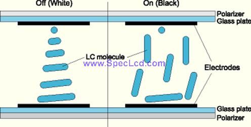 如果施加電壓,在我們的狀況中是一個(gè)垂直電場,將會(huì)摧毀液晶的螺旋結(jié)構(gòu)。這些分子會(huì)試著將他們自己排列成與電場相同的方向。在我們的例子里,那樣表示它們最后會(huì)與第二塊濾片垂直。在這個(gè)狀態(tài)下,偏向入射光線會(huì)通不過整個(gè)子像素(ON狀態(tài))。白點(diǎn)變成了黑點(diǎn)。