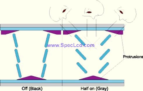 這一次,每個(gè)次像素分開到數(shù)個(gè)區(qū)域中。而且,偏向?yàn)V片不再是平坦而是突起的。結(jié)果是,液晶體不會(huì)以同一方向來排列或旋轉(zhuǎn)。突起濾片是術(shù)語「ridges」的來由。這也導(dǎo)出了專有名詞「multi-domain(多區(qū)域)」。子像素被分成數(shù)個(gè)區(qū)域而在其中液晶體可以自由來去在相反的方向,而獨(dú)立于其它液晶體。這技術(shù)的目的是盡可能創(chuàng)造需要的區(qū)域而讓使用者只察覺一個(gè)區(qū)域,而不管他們在畫面的什么地方。