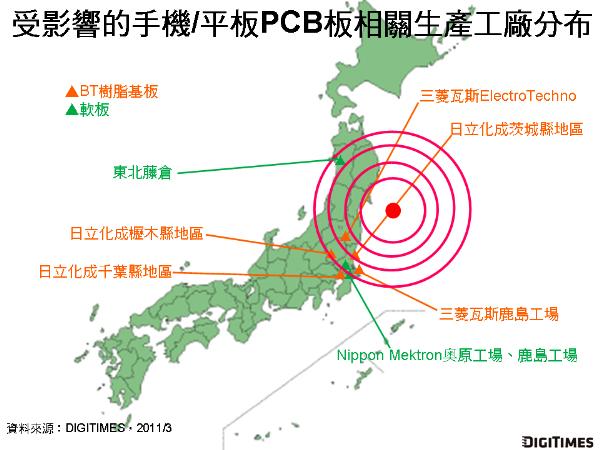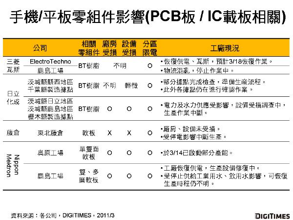 在手機/平板用PCB、IC載板材料BT樹脂等相關零組件方面,包含三菱瓦斯化學、日立化成、藤倉、Nippon Mektron等日廠旗下工廠受地震影響作業中斷,停止生產。