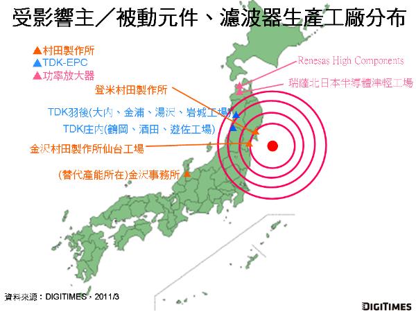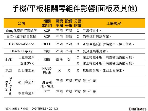 DIGITIMES Research最新報告指出,日本311強震造成日廠手機/平板相關零組件供應商分別遭受廠房、設備損壞,亦或海嘯沖擊、地方分區限電等影響,工廠作業停擺,影響超過20處工廠,在災后截至2011年3月16日仍未能正常作業。