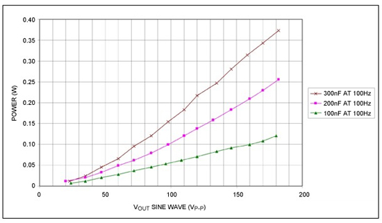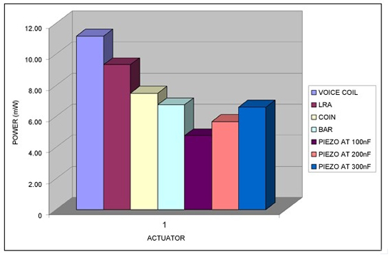 圖14顯示了連續工作的功耗。圖中壓電體由幅度為180V、頻率為100Hz的連續正弦波驅動。其它驅動器由3VDC或2VRMS (LRA 和音圈)驅動。