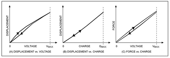 當對壓電體施加電壓時,由于極板間距離發生變化(圖3A),電容量也會隨之改變。壓電體位移正比于電場強度,而電場強度是極板間電壓和距離的函數。外加電壓和壓電驅動器產生的作用力保持著合理的正比關系(圖3C)。