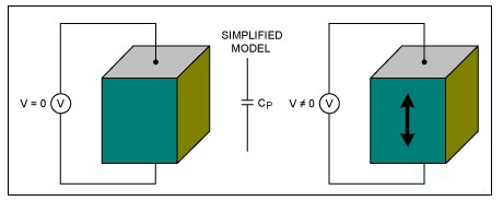 庫侖定律指出Q=CV,但在壓電體中電容不是常數,這是因為電容極板間距會隨著電壓變化而變化。