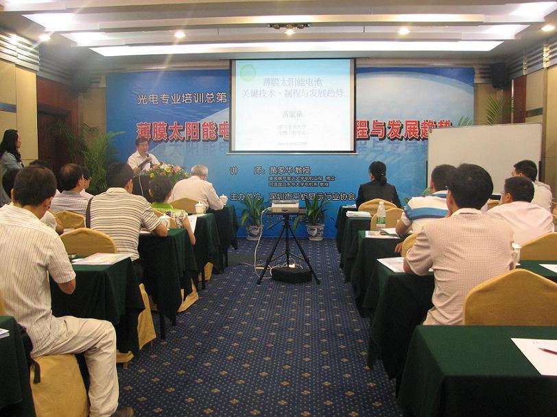 2011年6月1--2日,由深圳市平板顯示行業(yè)協(xié)會舉辦的“薄膜太陽能電池關鍵技術、制程與發(fā)展趨勢”培訓在深圳明華國際會議中心如期召開。共計30名來自各地光電企業(yè),還有部分光學企業(yè)的管理者、技術人員、市場人員參加了此次“薄膜太陽能電池關鍵技術、制程與發(fā)展趨勢”的專業(yè)知識培訓。深圳市平板顯示行業(yè)協(xié)會秘書長孫政民先生在開學儀式上致辭并講話。