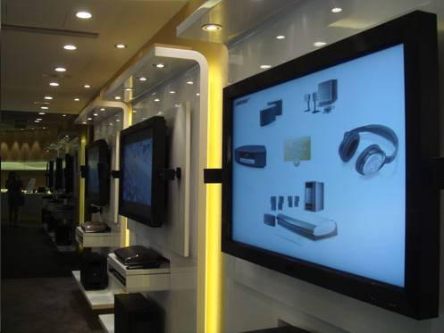 此次項目是對Bose音響位于香港國際金融中心商場(ifcmall)的專賣店進行信息化升級,提升消費者與產品的互動體驗。通過唯瑞工程師的實地考察,充分聽取客戶的實際需求,最終選用了Vewell46寸液晶觸摸屏V46-ST50A共15臺。該產品是唯瑞新源科技最新研發的一款46寸液晶觸摸顯示器,該觸摸屏擁有1920×1080的分辨率,450cd/㎡的亮度,3500:1的對比度,8ms的響應時間。該產品是為配合各種大尺寸高清平板顯示器而設計的新型觸摸方案,它將顯示器轉變為一個交互顯示設備。與計算機可組成最佳的交互式系統,還可以與網絡或普通電話組成實時、交互、高效的會議系統。