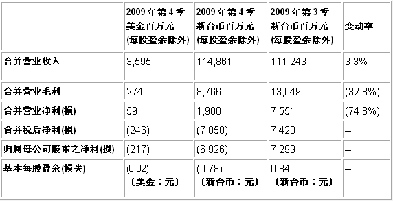 友達光電28日舉行法人說明會公布自行結算2009年第四季財務報表。總計第四季合并營業額為新臺幣1148億6100萬元,較2009年第三季增加3.3%。合并營業毛利為87億6600萬元,合并毛利率7.6%;合并營業凈利則為19億元,合并營業凈利率為1.7%。第四季合并稅后凈損為新臺幣78億5000萬元,其中歸屬于母公司股東之凈損為新臺幣69億2600萬元,第四季基本每股損失則為0.78元。