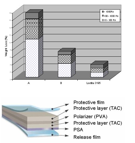 使用LOCA裝配顯示模塊的過程有兩種類型:室溫和真空。在真空裝配中,粘接過程中所用LOCA將暴露于高真空下。如果粘合劑在真空下重量損失較大,將需要更長的時間以達到所需的真空度,且由于某些成分的損失,將難以控制最終的粘合劑粘合層和粘接性能一致性。因此,在真空裝配過程中保持盡可能低的重量損失是非常重要的。漢高的LOCA產(chǎn)品設計具有低重量損失。圖1顯示了樂泰3195在三種真空水平下與兩種其他市售LOCA產(chǎn)品的重量損失比較。
