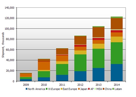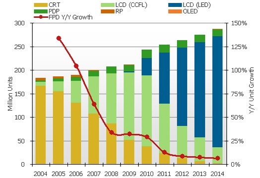 世界開始電視廣播開始進入商用化后,電視機的普及率非常迅速,市場保有量也處于高位,幾乎家家戶戶都有了電視。據DisplaySearch公司的報告顯示,2010世界電視的出貨量比上年增長16%,達2.43億臺,預測2011年將續增4.9%,達2.55億臺。展望2014年可達2.88億臺,2009~2014年的年均增長率為7%,一個成熟的產品能有這樣的增長速度,不能不令人驚奇。