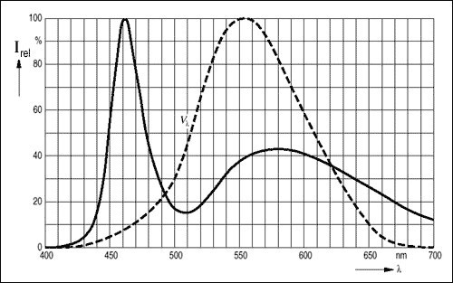 鑒于發(fā)光亮度、效率、壽命等因素,目前高亮度的液晶背光源通常采用白光LED。真正發(fā)射白光的LED是不存在的。它利用不同波長合成白色光。在發(fā)射藍光的InGaN基料上覆蓋轉換材料,這種材料在受到藍光激勵時會發(fā)出黃光。于是得到了藍光和黃光的混合物,在肉眼看來就是白色的。它的發(fā)光光譜見圖1。白光LED的發(fā)射波長(實線)包括藍光和黃光區(qū)域的峰值,但是在肉眼看來就是白色。肉眼的相對光敏感性(虛線)[1]。
