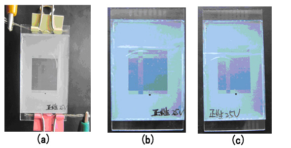 圖1 25V電壓誘導正性PDLC照片,(a)加電壓,(b)無電壓,(c)放置60天后