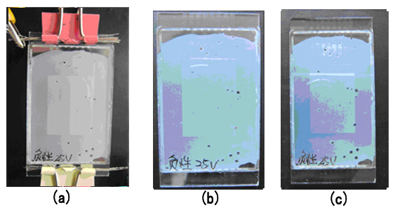 圖3 25V電壓誘導負性PDLC照片,(a)加電壓,(b)無電壓,(c)放置60天后