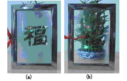 樣品制備實驗中使用的向列相液晶材料是PDLC005(石家莊鹿泉新型電子材料廠提供),其雙折射no=1.517,ne=1.723;使用的預(yù)聚合物是30%的環(huán)氧樹脂DCL3000,60%聚脂丙烯酸酯MR100,4%鏈轉(zhuǎn)移劑和4%的光引發(fā)劑TPO,2%硫嗡鹽配制成預(yù)聚物;將液晶與預(yù)聚合物以11的質(zhì)量百分比混合成液晶膠。使用的玻璃是3mm厚浮法玻璃(河北南玻公司提供);使用的襯墊料微球直徑20m(深圳納微科技公司提供)。將玻璃清洗干凈,在一張玻璃上撒布20m襯墊粉微球,之后蓋上另一張玻璃,兩張玻璃大部分重合,上下留出小部分不重合的臺階邊(方便后續(xù)施加應(yīng)力實驗)。用注射器將液晶膠滴在臺階處下面玻璃上,靠毛細(xì)現(xiàn)象使液晶膠充滿在兩張玻璃間重合部分。把夾著液晶膠的兩張玻璃放置于24W紫外燈下進(jìn)行紫外固化,采用打字復(fù)印膠片作為掩膜進(jìn)行選擇曝光,樣品距離燈約在30cm左右,曝光5分鐘,樣品由固化前透明變成固化后散射毛玻璃, 得到帶有圖案的制品。用不銹鋼方管制作了玻璃框,在玻璃框上安裝了鑰匙孔,擰轉(zhuǎn)鑰匙就可以方便施加剪切應(yīng)力,如圖1照片所示。圖1(a)是樣品散射顯示狀態(tài),鑰匙處于豎直位置。圖1(b)是樣品透光消隱狀態(tài),鑰匙處于水平位置。對制品施加剪切應(yīng)力時,制品變成半透明狀態(tài),字符圖案被消隱不清楚。