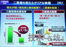 采用分時方式顯示3D影像時存在的問題是,左眼用影像和右眼用影像重疊時容易發(fā)生串擾現(xiàn)象。松下表示,在實現(xiàn)3D電視產(chǎn)品化時,通過改進PDP、液晶快門眼鏡及BD影碟機,減輕了串擾現(xiàn)象。