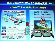 為了顯示3D影像,松下采用了結(jié)合使用120Hz頻率PDP、BD影碟機及有源方式液晶快門眼鏡的“分時方式“(圖2)。能以幀為單位交替顯示左眼用和右眼用影像,為了與影像顯示同步,利用液晶快門交替遮擋右眼和左眼的視線,使用戶的左右眼看到不同的影像,以此實現(xiàn)3D顯示。這種方式的特點是,能以3D方式觀看1920×1080像素的全高清影像。“CEATEC JAPAN 2008”之后,松下在展會上演示的都是基于分時方式的3D影像。