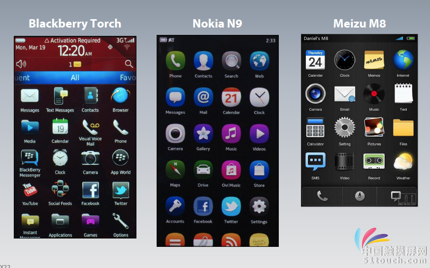 蘋果在法庭上顯示了十幾個三星手機,這些手機產品都有幾乎相同的用戶界面。為了證明有不止一種方法來設計觸控屏界面,蘋果提出了一些競爭對手的主屏幕。這些畫面是不同的,沒有侵犯蘋果的專利,這次是用魅族的例子來證明還有其他的方法可以實現觸摸屏的操作界面,來反駁三星。