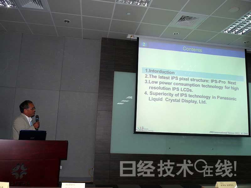 隨后,松下液晶顯示器公司商品開發中心顧問小野記久雄就可實現高精細化的IPS液晶面板技術的最新動向發表了演講。他介紹說,IPS液晶面板因視角依賴性小,此前主要用于大屏幕電視。但最近其用途也擴大到了智能手機和平板電腦等移動終端。在移動終端用途中,面板的低功耗化非常重要。實現低功耗化時,除了背照燈之外,還需要降低面板的功耗。為此,松下液晶顯示器公司開發出了全新的像素構造“IPS-Pro Next”,通過絕緣膜橫跨多個像素,以透明共用電極覆蓋TFT布線。該構造能夠使用適合實現低功耗的列反轉驅動方式。小野詳細解釋了該技術,此外,還介紹了光配向技術。