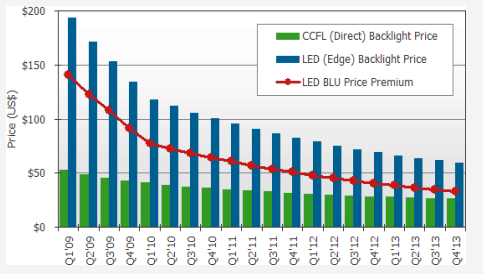 由于追求更好顯示效果及輕薄省電等特性,大多數(shù)面板廠與整機(jī)廠商均積極投入LED背光產(chǎn)品開發(fā)。相較于傳統(tǒng)CCFL背光而言,LED背光模塊主要發(fā)展關(guān)鍵就在于成本降低速度。有鑒于LED背光成本之重要性,DisplaySearch自2009年第二季起發(fā)布關(guān)于LCD背光模塊成本結(jié)構(gòu)分析報(bào)告,也是目前全球唯一針對(duì)CCFL與LED背光成本分析與預(yù)測(cè)報(bào)告。根據(jù)最新一期調(diào)查分析指出,以40寸液晶電視用側(cè)邊式LED背光模塊為例,DisplaySearch估計(jì)平均成本將由今年第一季118美元,到了第四季將下滑至100美元;而LED背光成本降低主要原因有快速增加的出貨量使得LED芯片與材料相應(yīng)下調(diào),同時(shí)LED發(fā)光效率提升進(jìn)而降低LED芯片使用數(shù)量。