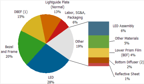 由圖二可知以40寸液晶電視LED背光模塊而言,主要成本構(gòu)成有LED芯片、導(dǎo)光板(LGP,lightguideplate)以及增亮膜(DBEF,dualbrightnessenhancementfilm),而在傳統(tǒng)傳統(tǒng)的CCFL背光液晶電視并沒(méi)有使用到這三項(xiàng)元器件。其中關(guān)于LED燈源部份(不包括LED芯片)就占了整個(gè)背光模塊34%成本,估計(jì)導(dǎo)光板占13%、增亮膜占15%、LED組裝占6%;由此我們清楚地知道LED背光設(shè)計(jì)、輸出效率以及芯片成本將是降低LED背光板成本主要方向。