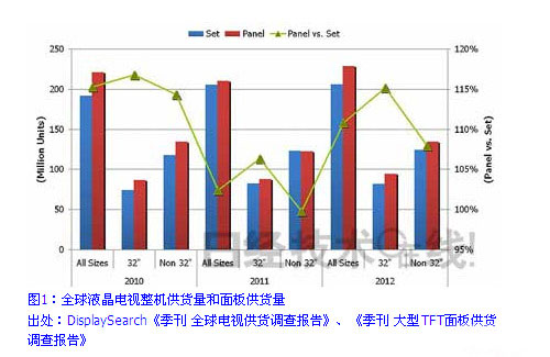而且,液晶電視面板供貨量的增加在2012年下半年超出預想,2012年總供貨量有可能會達到2.28億塊(比2011年增加8.6%)。而液晶電視整機供貨量從第一季度到第三季度均比上年減少1~3%,2012年總供貨量的預測值估計將不得不下調至2.6億萬臺(比2011年增加0.4%,上次預測為2.8億臺)。